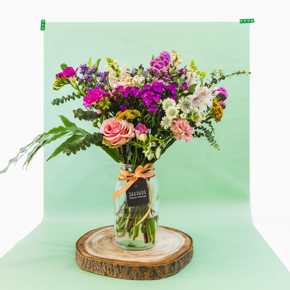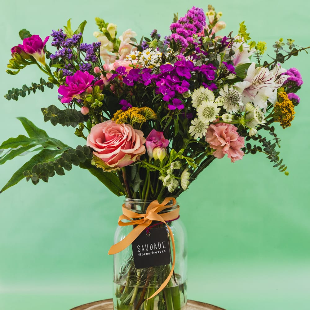 Our famous large glass arrangement (1,5L) composed with a selection of special varieties of flowers on a delicate and vibrant color palette.