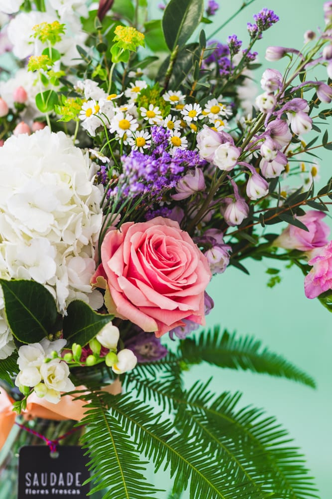 Composition with aprox. 15 steams of premium blooms as delfinium, roses, hydrangea, ranculus, camomile, fresias.