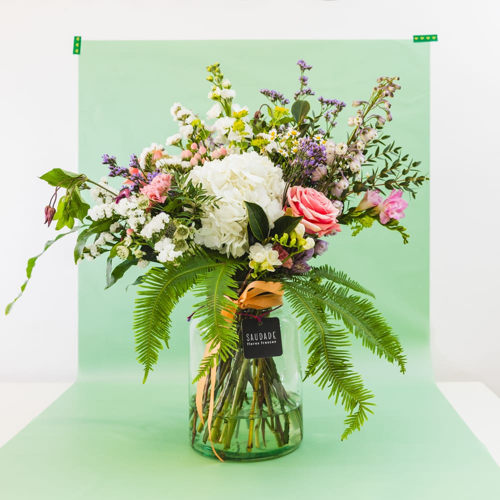 Our famous XL glass arrangement (2L) composed with a selection of special varieties of flowers on a delicate and vibrant color palette.
