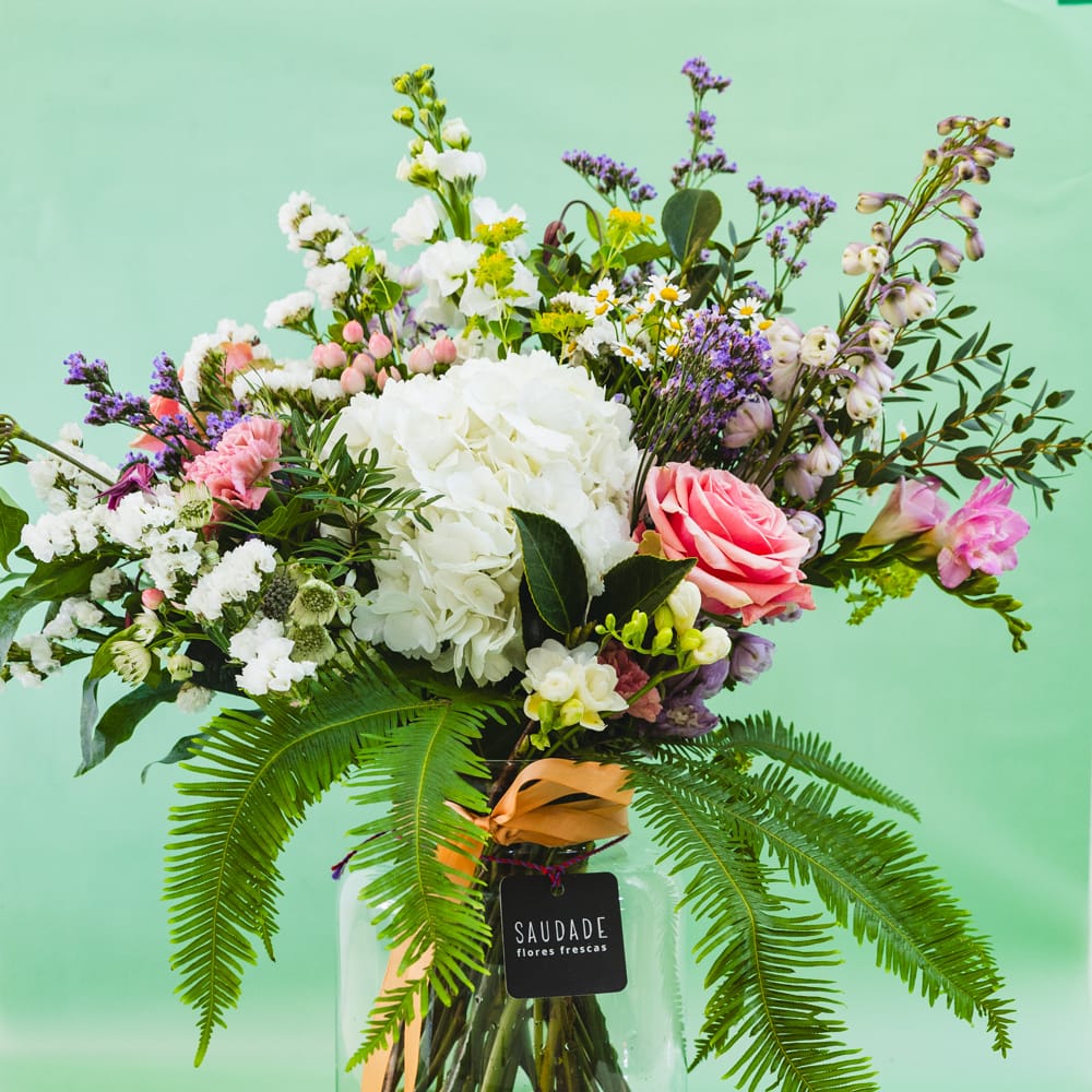 Composition with aprox. 25 steams of premium blooms as delfinium, roses, hydrangea, ranculus, camomile, fresias.