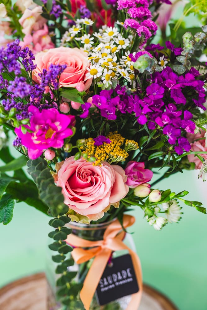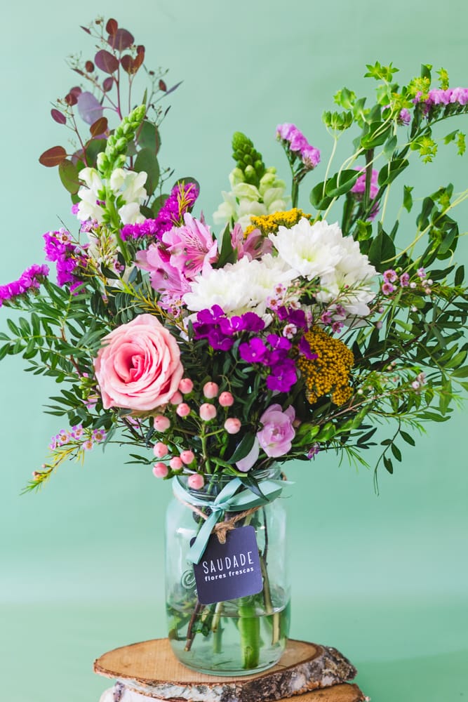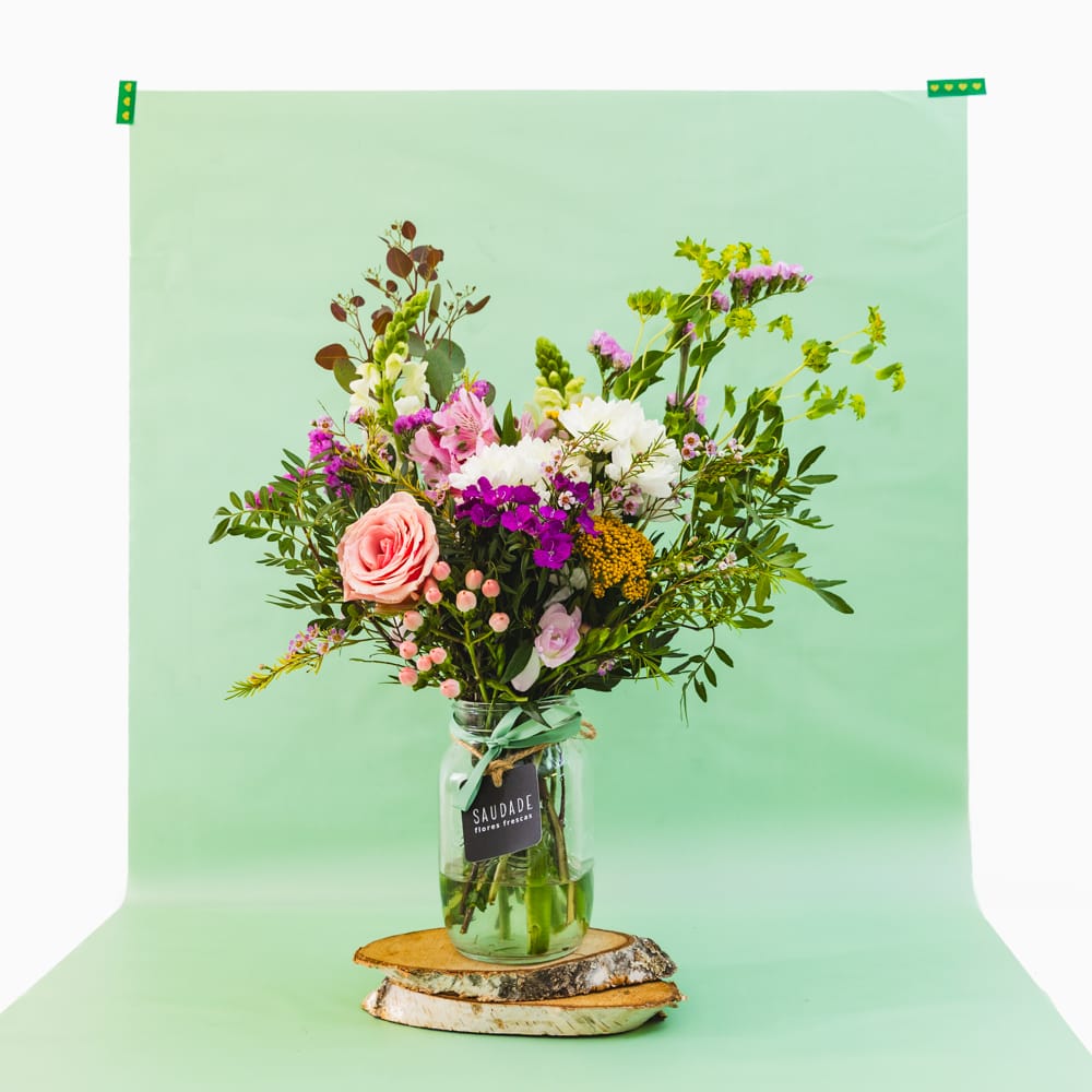 Medium glass arrangement with glass (1L) included, with a selection of special varieties of flowers on a delicate and vibrant color palette.