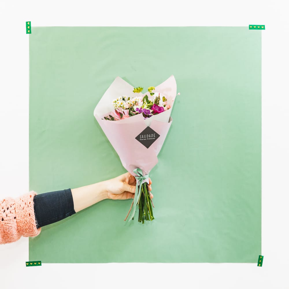 Bouquet composto em média de 5 pés de flores premium frescas da época (como ranunculos, frésias, matricária) + verdes. Embrulhado em papel especial e fita de tecido.